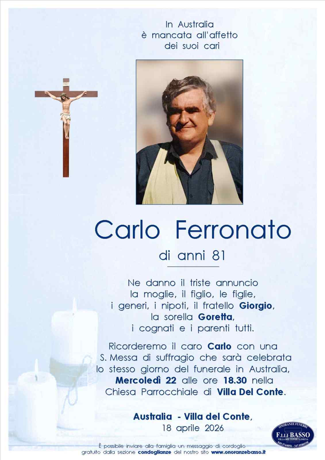Ricorderemo il caro Carlo con una S. Messa di suffragio che sarà celebrata